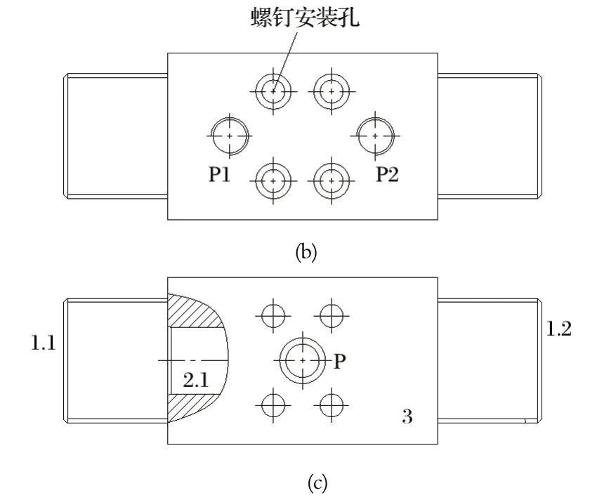 (2) 將兩個插裝閥組合設計成一個獨立的液動換向閥,再安裝到閥組油路塊上。如圖6 所示,獨立的液動換向閥包含一個獨立的閥體 3,兩端分別安裝有一個插裝組件 2 和一個控制蓋板 1;閥體內部設計有油孔,用于連接兩端的插裝閥;閥體外側安裝面上設計有兩個進油孔 P1 和 P2,通過管接頭連接兩個泵裝置;閥體內側安裝面上設計有一個出油孔 P,閥組油路塊上只需要設計一個與出油孔 P 配套的供油孔即可;閥體上設計有螺釘安裝孔,用于將液動換向閥安裝在閥組油路塊上。