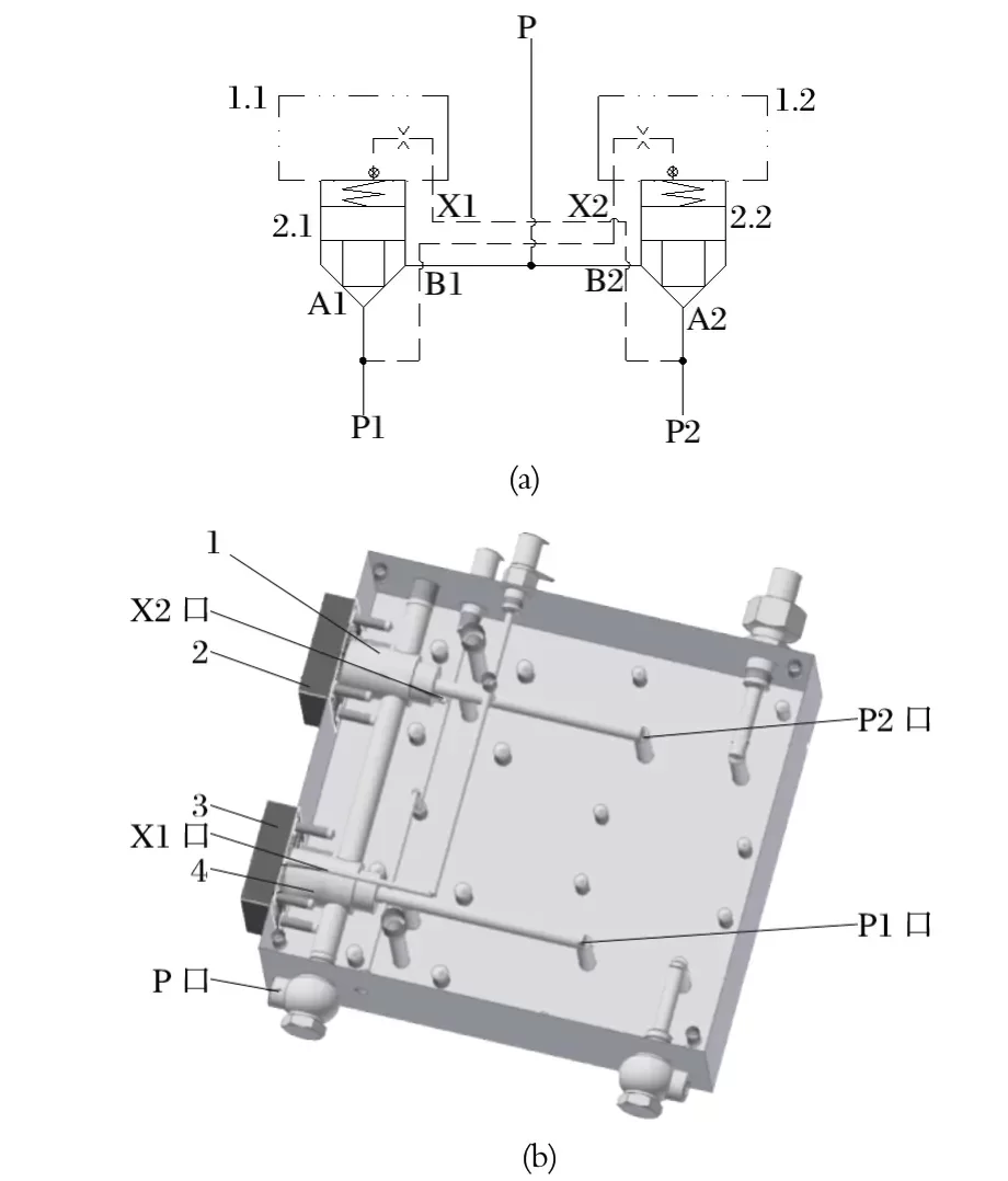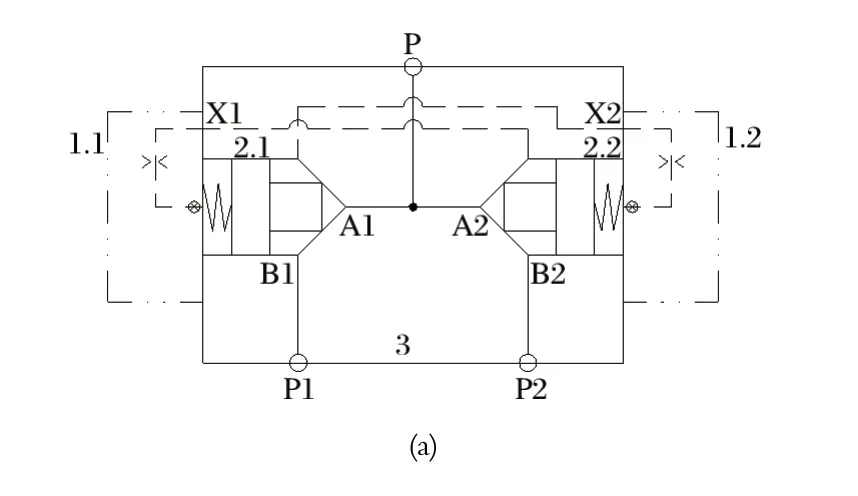 新型液動換向閥是由兩個二通插裝閥組合而成的選擇回路,具備二位三通方向控制閥功能,以實現兩套泵裝置的切換。中信重工 E6118B/E6119B 型液壓站的液壓閥組如圖5 所示。圖5 中,當 P1 處的泵裝置工作時,插裝組件 2.1 打開,插裝組件 2.2 關閉,由 P1 處的泵裝置向 P 口供油,P2 處的泵裝置可以維修或停用待命;反之,當 P2 處的泵裝置工作時,插裝組件 2.2 打開,插裝組件 2.1 關閉,由 P2 處的泵裝置向 P 口供油,P1 處的泵裝置可以維修或停用待命。