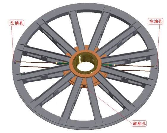 天(導向)輪生產完成后到到用戶安裝使用,一般會滯留一段時期,此時管路中及軸瓦內在制造廠所加的潤滑脂很可能已經變質失效、風干、附著在油管內壁和軸瓦油槽中,甚至形成堵塞,因此在使用前需要對潤滑管路及軸瓦進行清洗,保證潤滑油路的暢通。清洗時,將煤油等清洗劑通過輪緣上注油孔注入,游動輪輪轂中部設有2-M33×2出油口(此口也可以做注油口使用),清洗完成后用螺塞堵住。