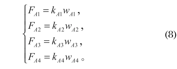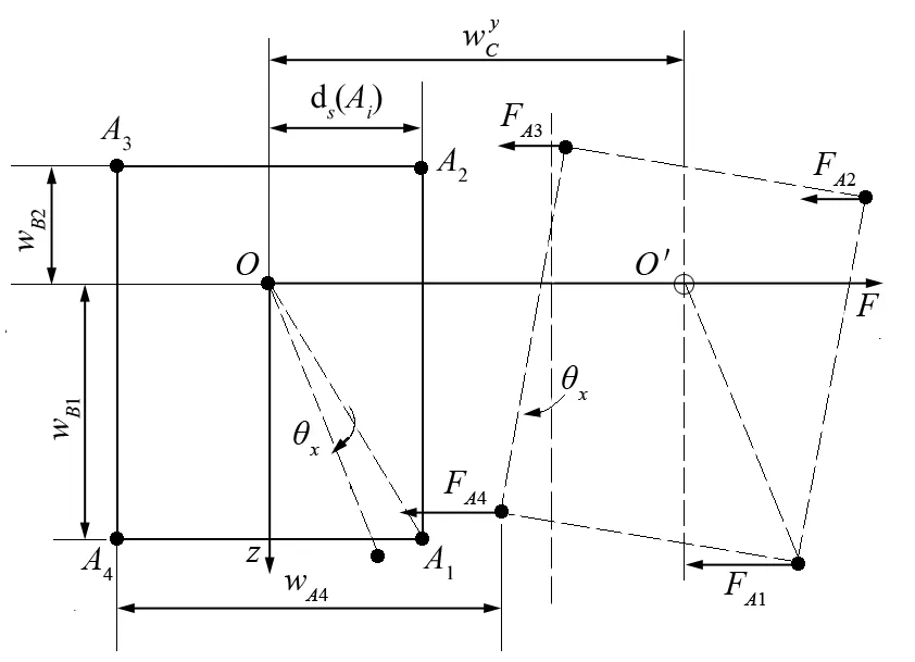 提升容器的罐耳在其中一個方向不對稱布置,由于 4 根罐道繩底部張緊力相同,在容器上下 4 個約束點平面上,罐道繩的橫向剛度相同,其力臂越大的約束點,水平位移越大,它對容器的水平約束力越大,使容器產生一個水平轉矩。當容器在水平 y 軸上受外力 F 作用,在罐耳 A1、A2、A3、A4 處產生的橫向位移依次為 wA1、wA2、wA3 和 wA4。罐耳 A1、A2、A3、A4 處的橫向力依次為