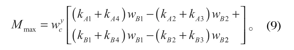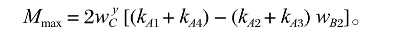在橫向位移不變的情況下,提升容器的靜態轉矩與罐道繩橫向剛度呈線性關系。當容器在水平面內達到受力平衡時,容器產生了一個扭轉角 θx。Mmax越大,扭轉角 θ x 越大,其扭轉引起在 y 軸的位移為wBi θx。