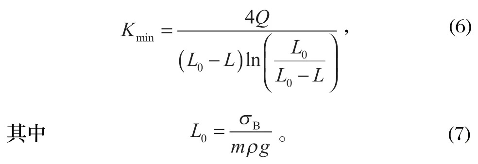 式中:L0 為罐道繩ji限懸垂長度,m;σB 為罐道繩的抗拉強度,N/m2;m 為罐道繩的安全系數,取 m=6;ρ 為罐道繩的密度,平均取 9 000 kg/m3。