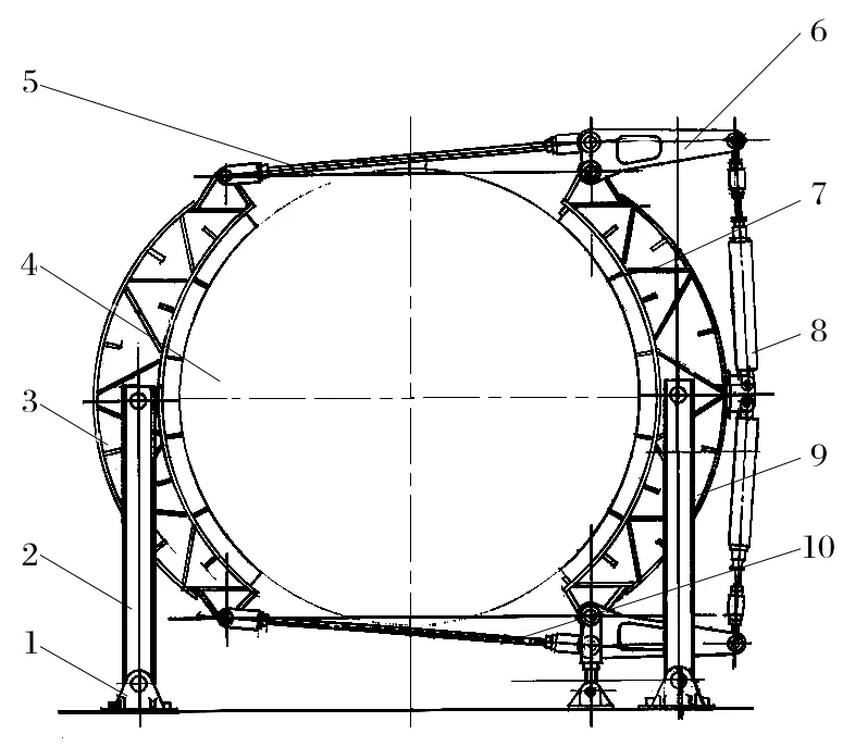 (6)方案簡單 對于滾筒直徑大于4 m 的舊式提升機,推 薦采用氣壓-重錘平移式制動器。該改造方案不僅保留了滾筒制動輪構(gòu)件、基礎(chǔ)、前后制動梁,還保留了三角杠桿和頂部拉桿,方案更為簡單。以 HKMZ 型提升機為例,改造前后分別如圖4、5 所示。對比兩圖可知,改造量更少,因而成本更低,且造型美觀,達到了預(yù)期的效果。
