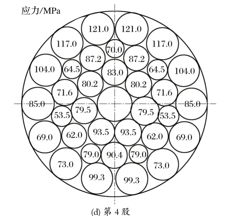 將鋼絲繩纏繞在直徑為 2 m 的天輪上,在實際求解時,將計算內部接觸點位置作為求解的計算點。此時,選取位于摩擦天輪繩槽上下兩側和右側的部分繩股作為研究對象,并且沿著順時針方向進行標記,標記出第 1、2、3、4 股。仿真分析得到的鋼絲繩應力分布如圖4 所示。